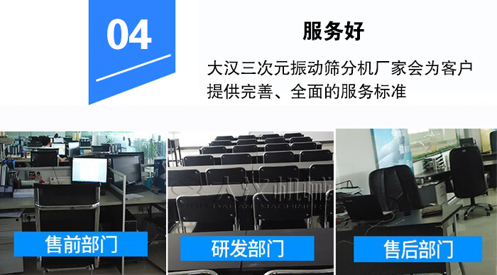 大漢三次元振動篩分機廠家會為客戶提供完善、全面的服務標準,包括售前、售中、售后,為客戶提供選型指導,并負責后期的上門安裝、調試指導、維修保養、維修、保養等工作,廠家支持上門安裝、調試指導、維修保養等服務。