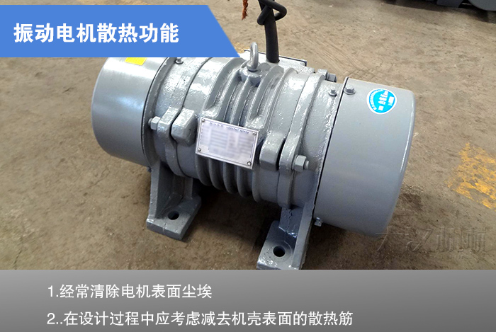 普通電機--端有風扇,工作時使風向順著機殼上面的立筋流動,不僅散熱較快,而且也清除了上面的塵埃,使電機在良好的狀態下工作。而振動電機因無風扇可散熱,全靠自然冷卻,再加上工作環境大都非常惡劣,粉塵大,粉塵極易在電機表面堆積,從而引起內部溫度過高,燒毀電機。