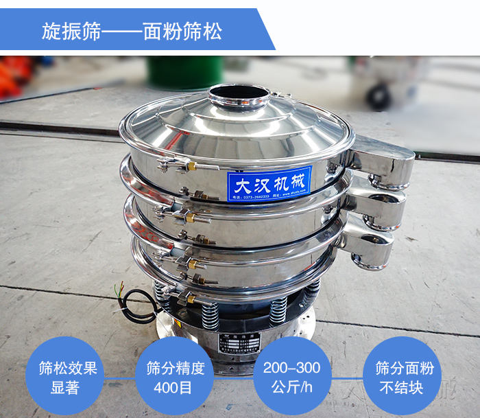 旋振篩作為精度較高的面粉振動篩,不僅能夠輕松勝任面粉的雜質篩選工作,而且對面粉的篩松效果顯著,完全符合由此篩分需求的客戶使用,但是篩分產量不及直排式面粉振動篩大,一般是200-300公斤/h。除此之外,為了提升面粉的品質和經濟價值,很多面粉廠會對面粉成品進行進一步的精選,以提升面粉的細度和精度,篩分精度要求在400目,旋振篩作為可以輕松處理400目以內的高精篩分設備來說,在面粉的精選方面起著十分關鍵的作用。