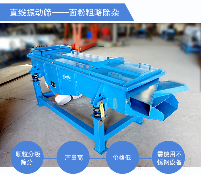 直線振動篩主要是進行顆粒分級和篩分的設備,有著產量高、篩分效率高的顯著優勢,但是篩分精細度不及旋振篩。面粉廠用直線振動篩一般也不做高精度的篩分之用,而是和直排篩一樣,用來處理類似于合格證、線頭等的較大的雜質,篩分產量基本和同型號的直排篩相差不大,但是其造價卻遠遠低于直排篩,因此比較喜歡低價格的客戶常常會用傾向于用直線式面粉振動篩來取代直排篩,但是需要注意的是此時的直線篩篩機必須使用不銹鋼制作,以滿足食品行業的衛生要求。