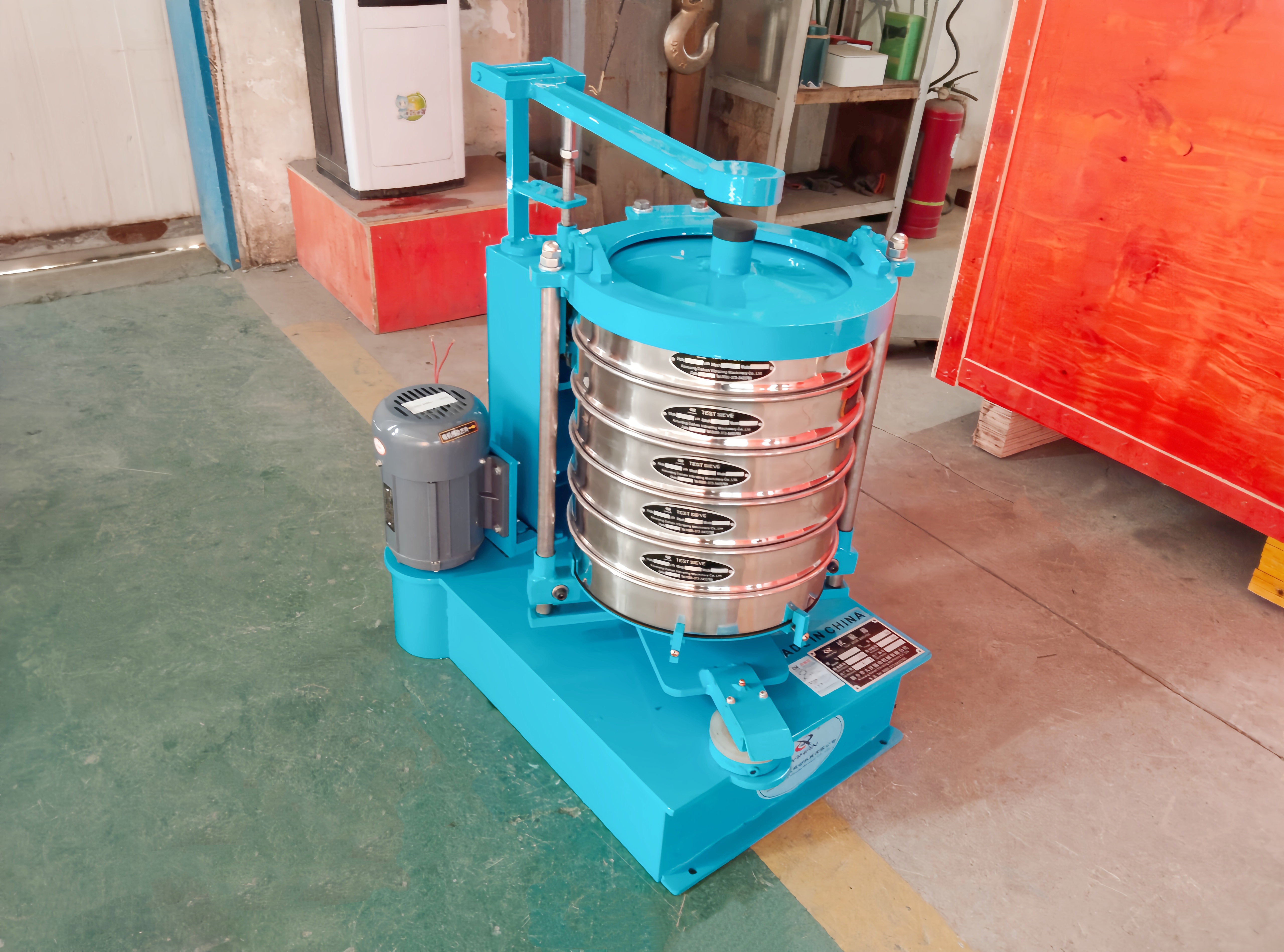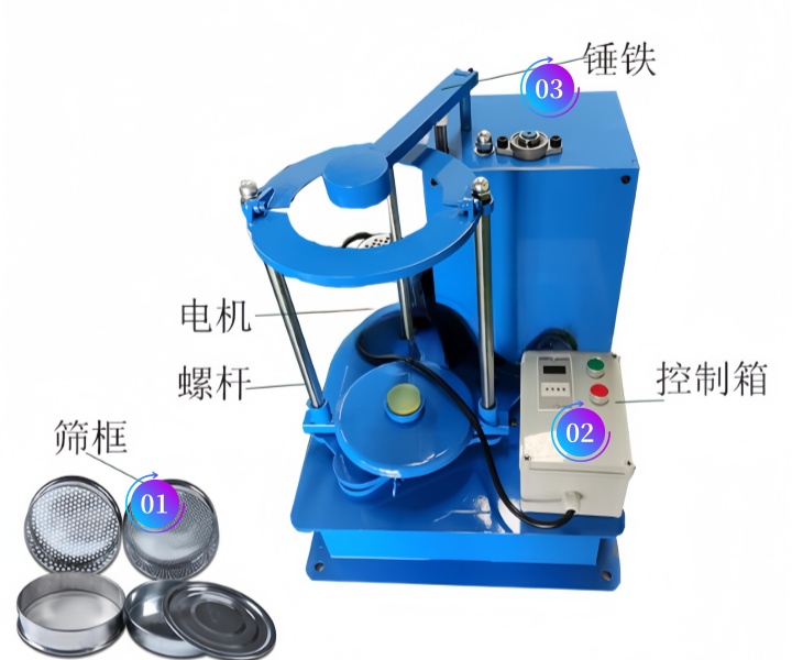 電機啟動后,通過同步帶帶動齒輪變速,驅動主軸旋轉;主軸帶動偏心輪,使滑板與篩具做水平往復圓周搖動;同時主軸帶動頂桿齒輪,頂擊拍擊重錘,對篩框頂部進行垂直高頻拍擊。物料從頂部篩框加入后,在搖動 + 拍擊雙重作用下快速分散、分層,小于篩孔的物料逐級透過篩網落入下層,大于篩孔的物料留在對應篩層,最終實現粒度分級與檢測。