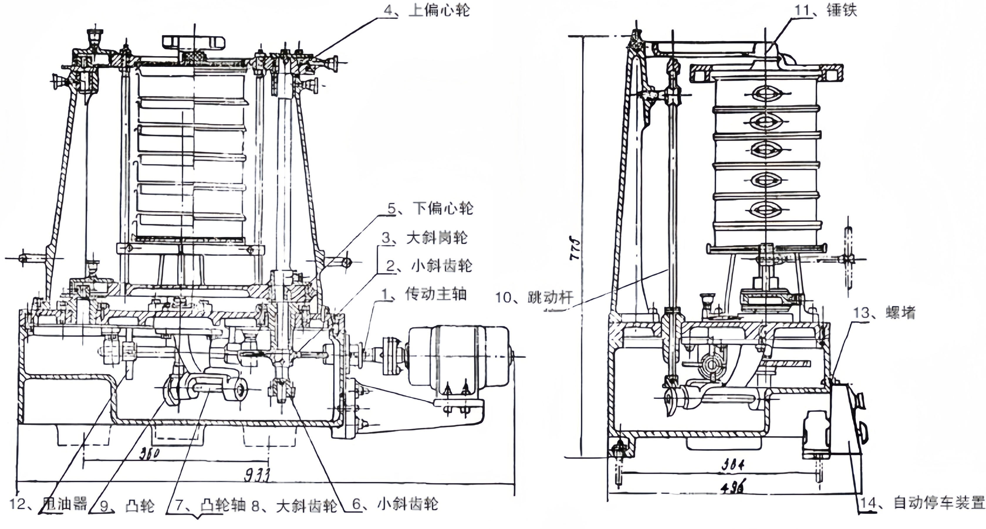 拍擊機構:由拍擊重錘、頂桿、行程調節桿組成,垂直拍擊篩框頂部,強化物料分散。