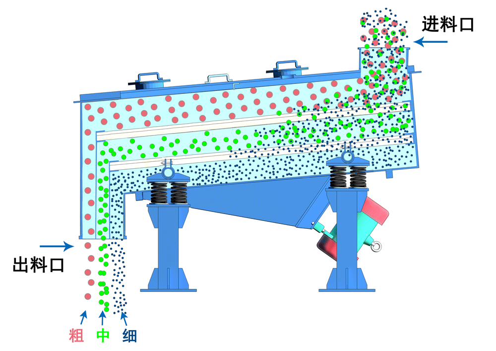 標準的振動篩分機設備工作原理是利用振動原理來實現不同物料分級或篩選,通過振動源帶動篩箱運動,使物料在篩面上做定向運動,依據顆粒大小差異透過不同孔徑的篩網,從而完成物料的分離與提純。根據振動篩分機設備的工作原理,制造設備的型號也不同。