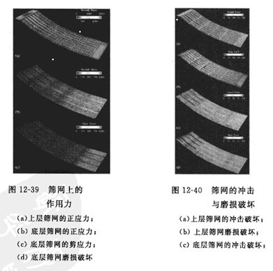 振動篩分機的DEM仿真結(jié)果可以用于分析顆粒群再篩網(wǎng)上的松散度、振動強度、料層厚度、篩孔孔徑和篩面傾角等參數(shù)對分離粒度及篩分效率的影響及相互作用。顆粒群再篩網(wǎng)上的流動平衡、顆粒對篩網(wǎng)的沖擊速度計施加在篩網(wǎng)上的載荷也能通過DEM仿真結(jié)果獲得,從而確定篩網(wǎng)所受的應(yīng)力、篩網(wǎng)的磨損及篩分裝置的功率、圖12-39和圖12-40分別為Yuan等人通過DEM仿真獲得的篩網(wǎng)上的作用力圖和篩網(wǎng)的沖擊與磨損破壞圖。